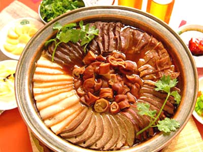 鹵煮火燒在北京是一種盡人皆知的食品,它是將火燒和燉好的豬腸和豬肺放在一起煮(有時(shí)也用豬腰子),買一碗主食副食和熱湯都有了。